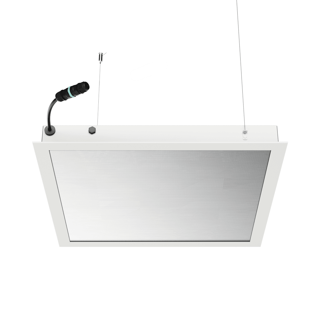 Die Front der Leuchte besteht aus Aluminium und 4 mm starkem, schlagfestem (Klasse IK09) und chemikalienbeständigem Hartglas. Das System modularer Blenden (Glas / Opal / PRM) ermöglicht die Auswahl der geeigneten optischen Eigenschaften je nach Anwendungsanforderungen – von gleichmäßigem, diffusem Licht bis hin zu präzisen gerichteten Lichtverteilungen. Die SM-Version ist für die Montage in Moduldecken vorgesehen.