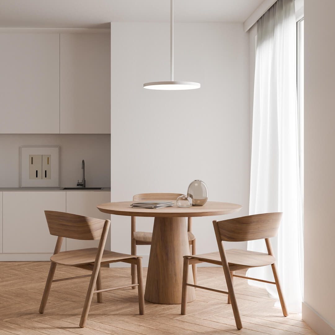 Jede der Formen behält eine einheitliche Designsprache bei – denselben Rhythmus, denselben Charakter des Lichts. Die Leuchte bietet Licht mit einer Farbtemperatur von 3000 K und einem Farbwiedergabeindex Ra ≥ 90, was eine natürliche Farbwiedergabe und ein angenehmes Lichterlebnis garantiert. Die verfügbaren Leistungen (10 W / 19 W / 38 W) ermöglichen es, die Lichtintensität an die Größe des Innenraums anzupassen: 1000 lm – Stimmungslicht, 1900 lm – Allgemeinbeleuchtung, 3900 lm – Architekturlicht. Die DALI-Steuerung oder die klassische Ein-/Aus-Steuerung ermöglichen eine vollständige Kontrolle über die Atmosphäre des Raumes. Der präzise gefertigte Körper aus pulverbeschichtetem Aluminium und der milchige PC-Lampenschirm bilden ein Duo aus Langlebigkeit und Leichtigkeit. Die Kollektion ist in vier raffinierten Farbtönen erhältlich: Gold RAL1036 – warmer, luxuriöser Akzent, Grau RAL7016 – subtil und architektonisch, Weiß RAL9016 – rein und zeitlos, Schwarz RAL9005 – tiefer Kontrast und Eleganz. Jede Farbe wurde so ausgewählt, dass sie mit modernen Materialien harmoniert: Beton, Holz, Glas und Stoffen mit natürlicher Struktur.